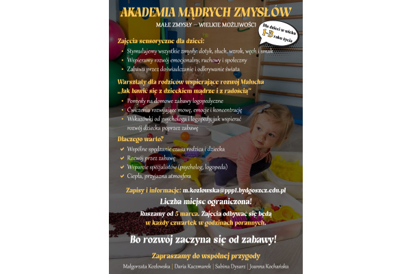 Serdecznie zapraszamy Dzieci wraz z Rodzicami do AKADEMII MĄDRYCH ZMYSŁÓW.