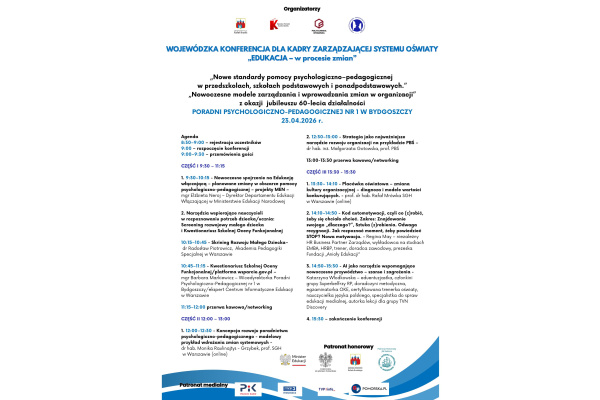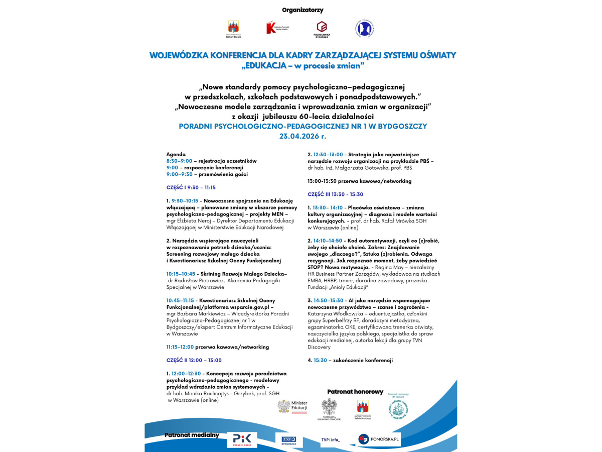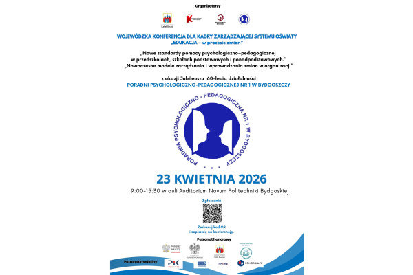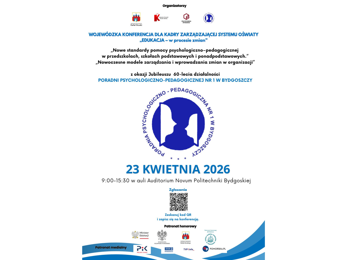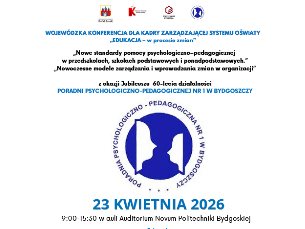 Serdecznie zapraszamy dyrektorów i wicedyrektorów placówek edukacyjnych na Wojewódzką Konferencję „Edukacja – w procesie zmian”, organizowaną z okazji Jubileuszu 60-lecia Poradni Psychologiczno-Pedagogicznej nr 1 w Bydgoszczy.